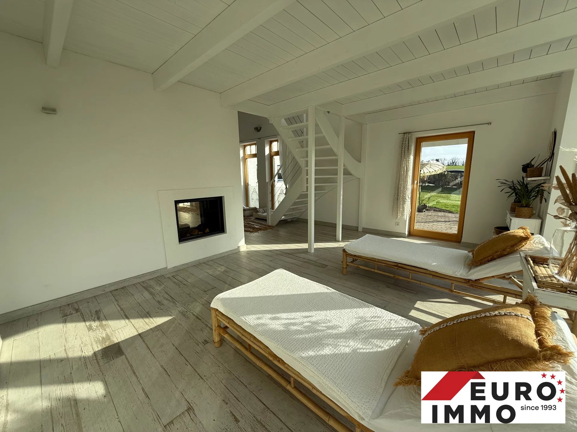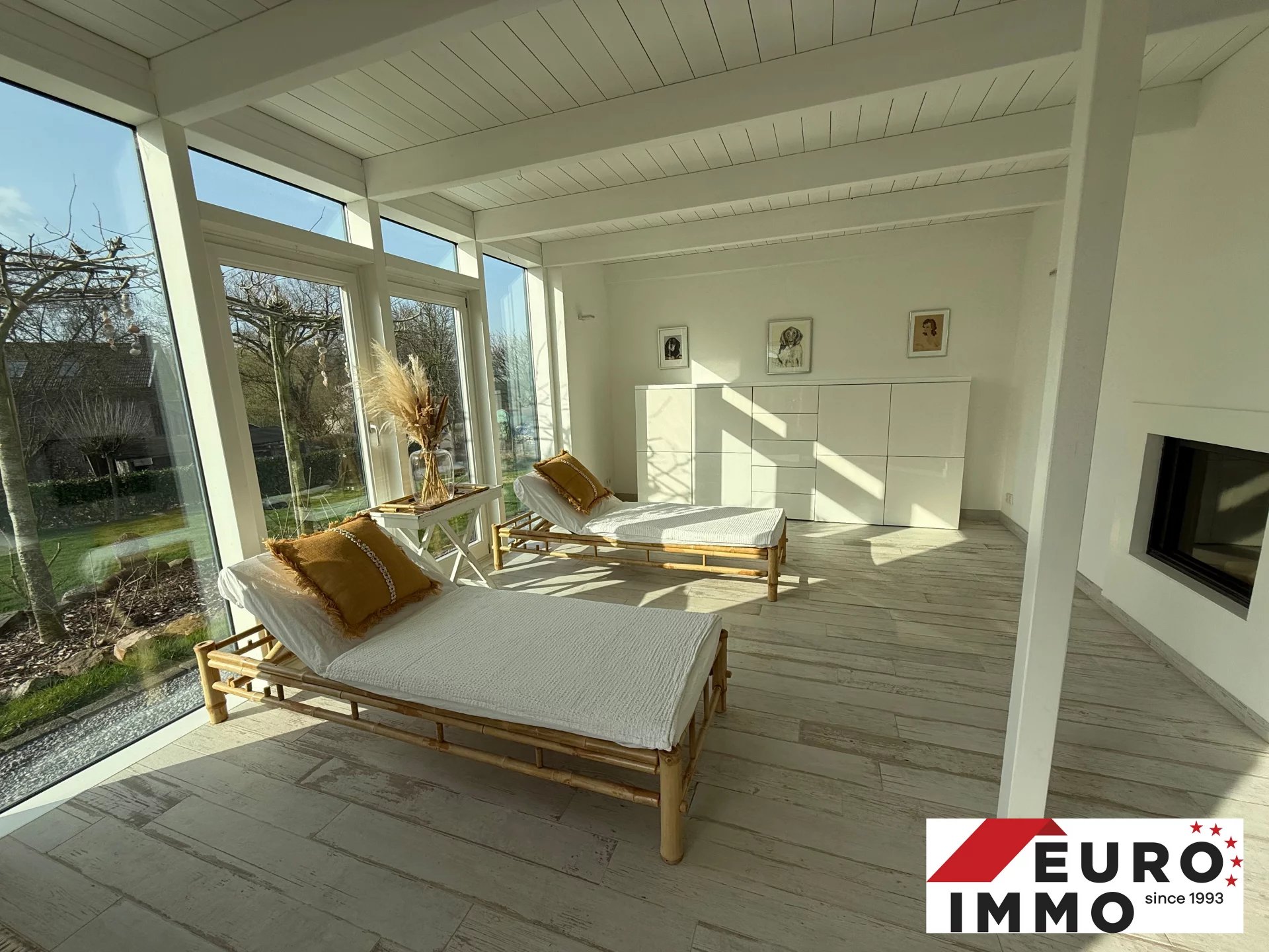 Ein stilvoll integrierter, offener Kamin sorgt für Gemütlichkeit und zoniert den Raum elegant.