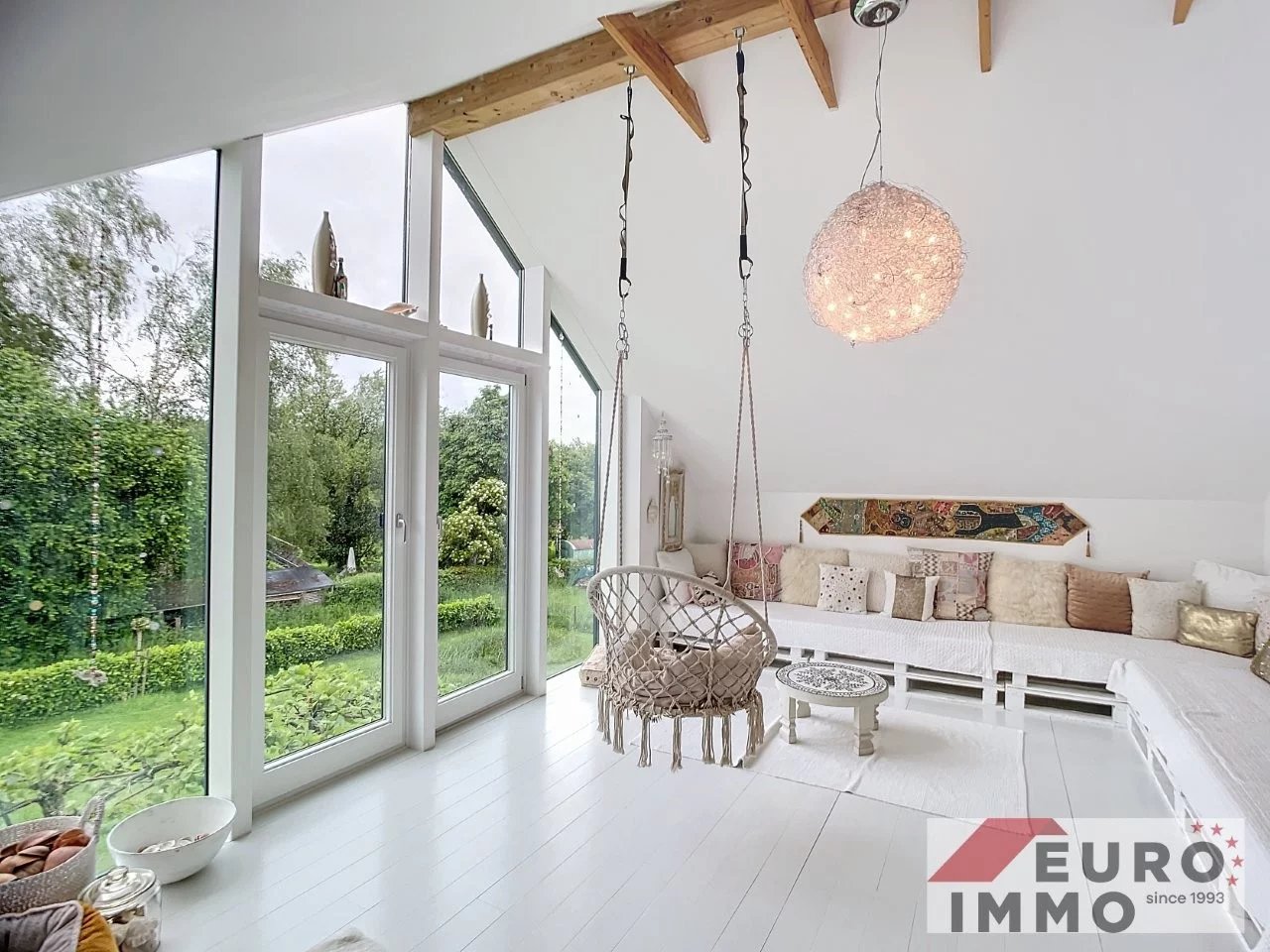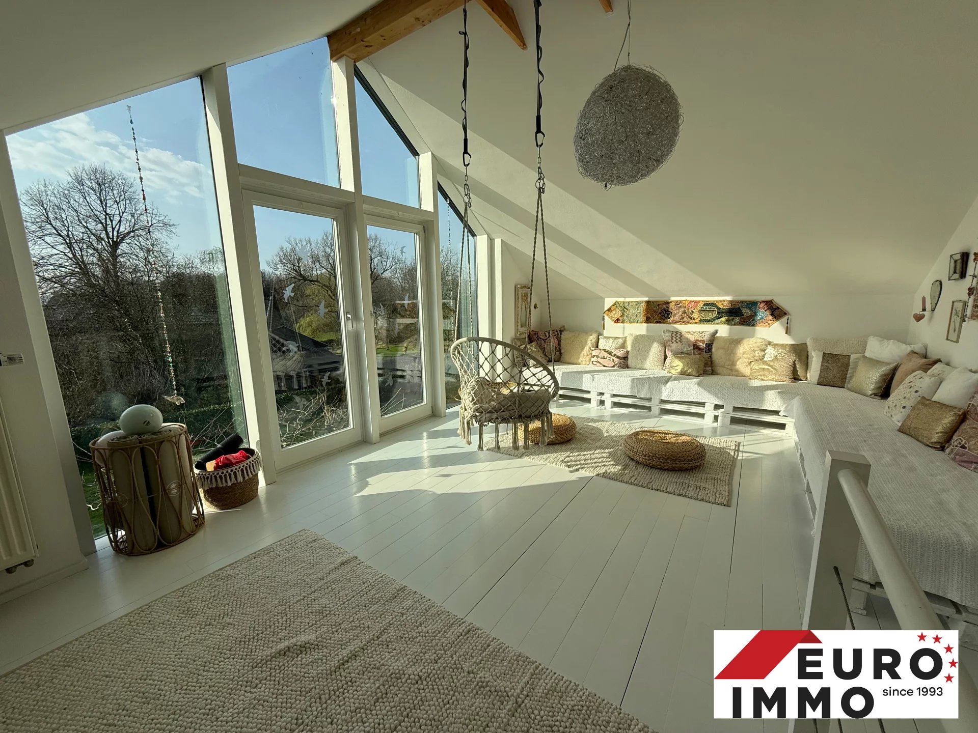 Der weitläufige, lichtdurchflutete Wohnbereich mit offenem Dachstuhl und imposanter Deckenhöhe bietet ein unvergleichliches Raumgefühl.